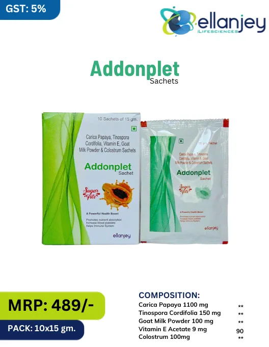 | Composition | Carica Papaya 1100 mg, Goat Milk Powder 100 mg, Tinospora 150 mg & Vitamin E 9 mg + Colostrum 100 mg sachets |